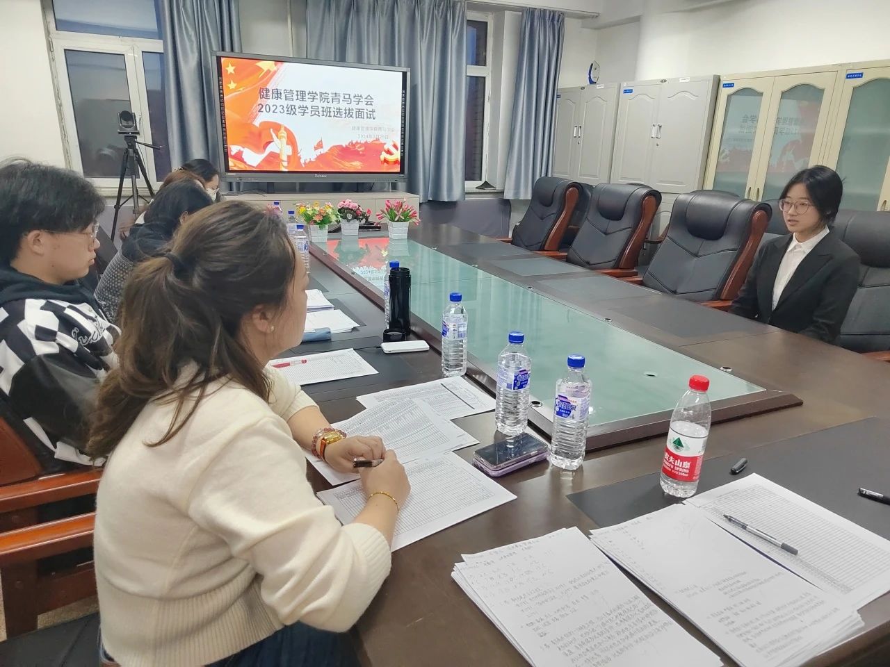 笔试结束后,共有104名学生进入面试环节,学生们就“新青年应具有什么样的品质”的话题,结合自身优缺点与老师进行了深入的交流,充分展现了2023级学生们积极进取、务实向上的精神风貌。